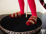 The Earl is rather flashy, wearing bright red stockings and velvet footwear.
